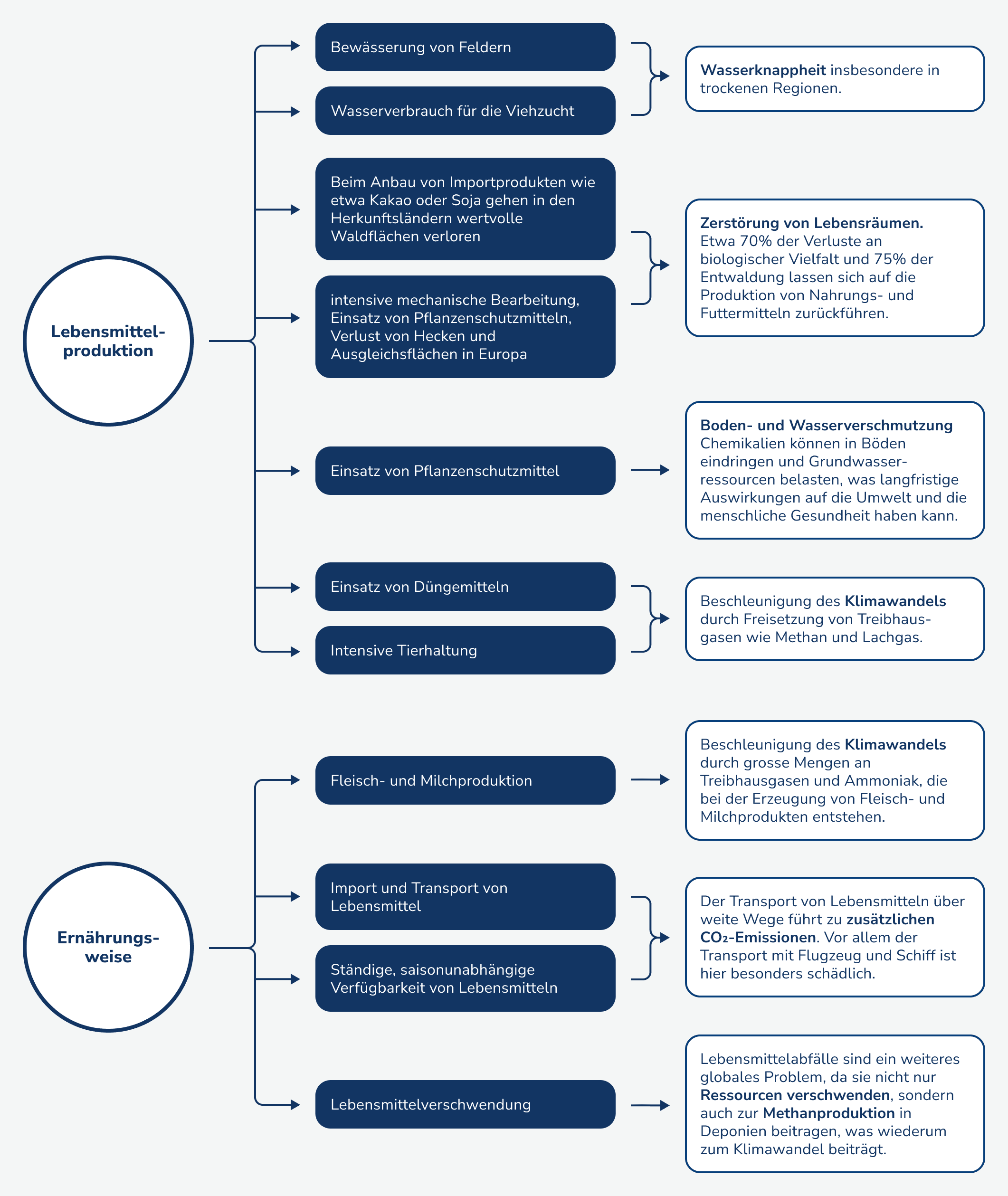 Umweltbelastungen im Bereich der Ernährung sind ein bedeutendes globales Problem, das sowohl lokale als auch globale Auswirkungen hat. Folgende Grafik zeigt den Zusammenhang zwischen Ursachen und Auswirkungen: