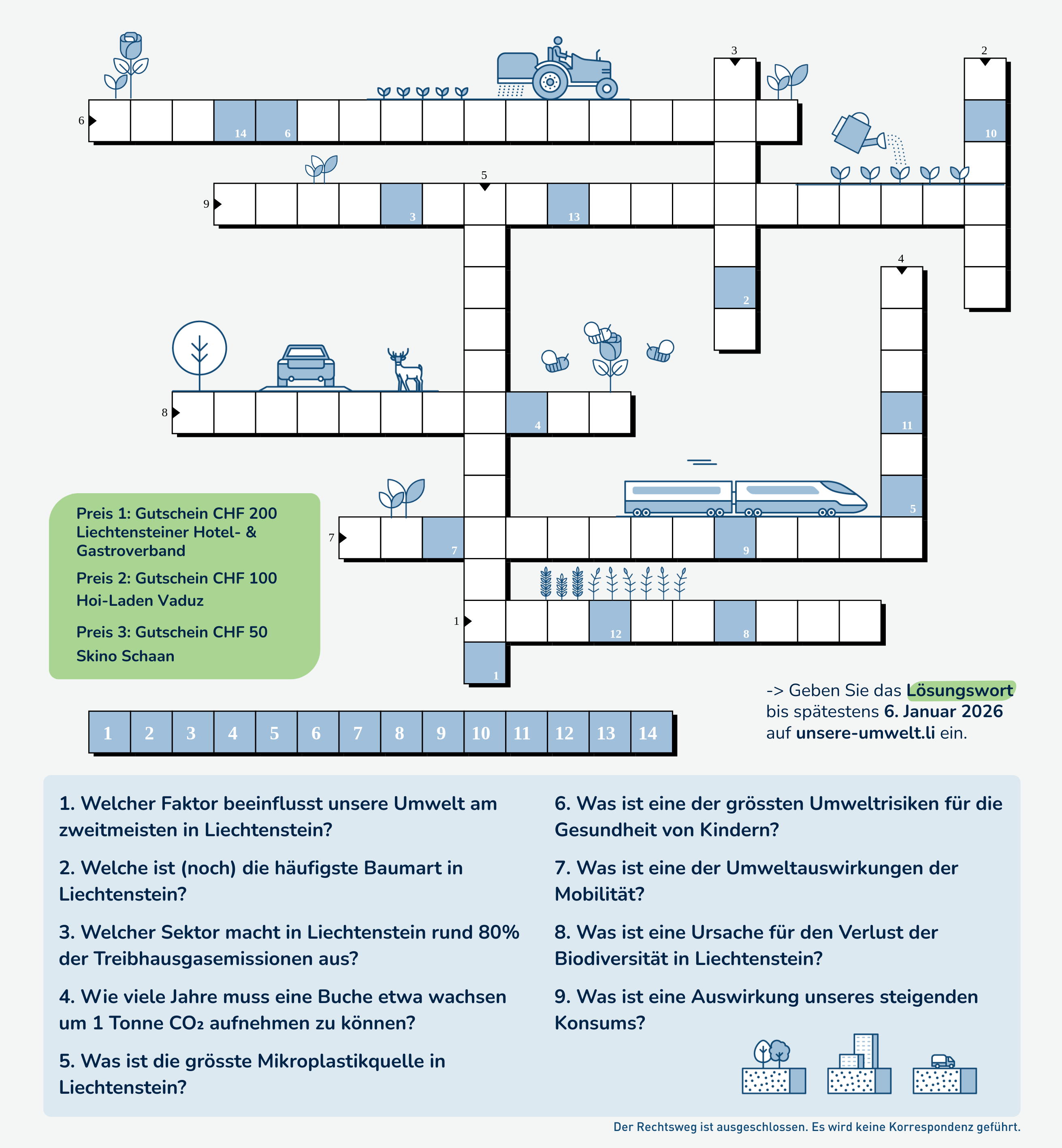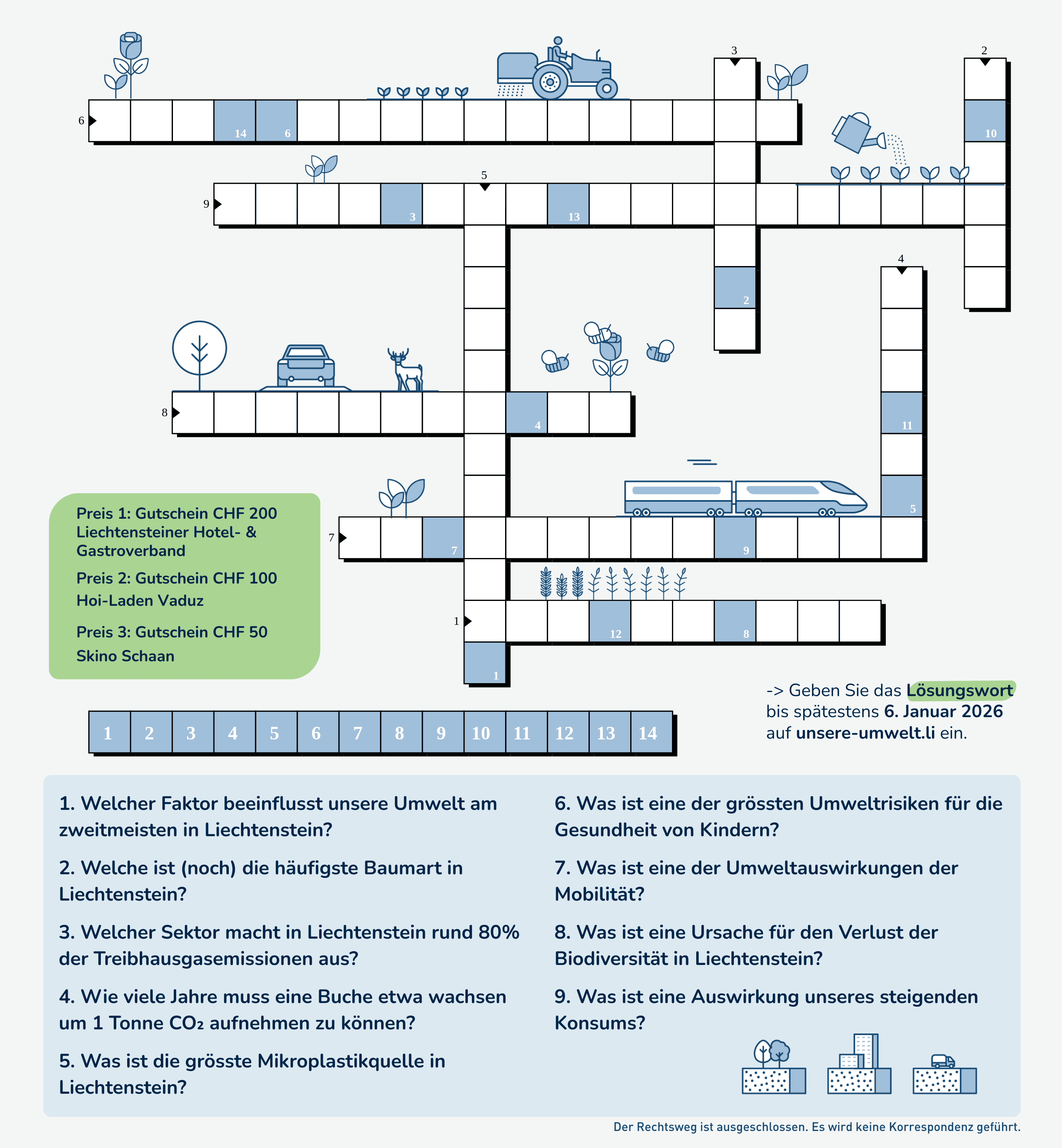 Senden Sie das Lösungswort ganz einfach per E-Mail an hoi@unsere-umwelt.li. Einsendeschluss ist der 6. Januar 2026.